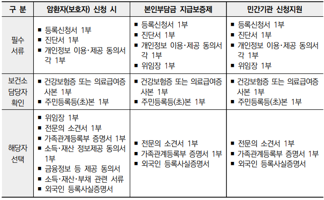 3. 등록신청은 암환자 주민등록지 관할 보건소에서 하되 방문이 어려운 경우 담당자와 협의하여 등기 또는 E-mail로 가능합니다.