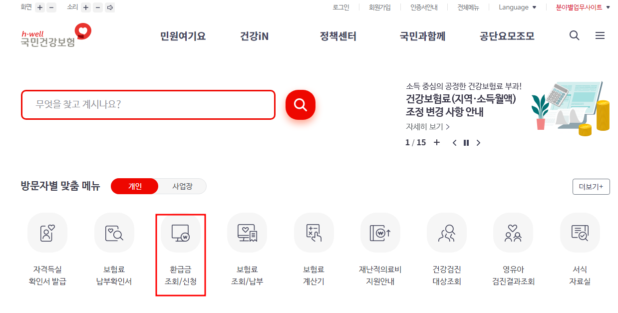아래는 의료보험 공단 홈페이지입니다. 첫 화면에 "환급금 조회/신청" 메뉴가 바로 보이므로 클릭해서 들어가시면 됩니다.